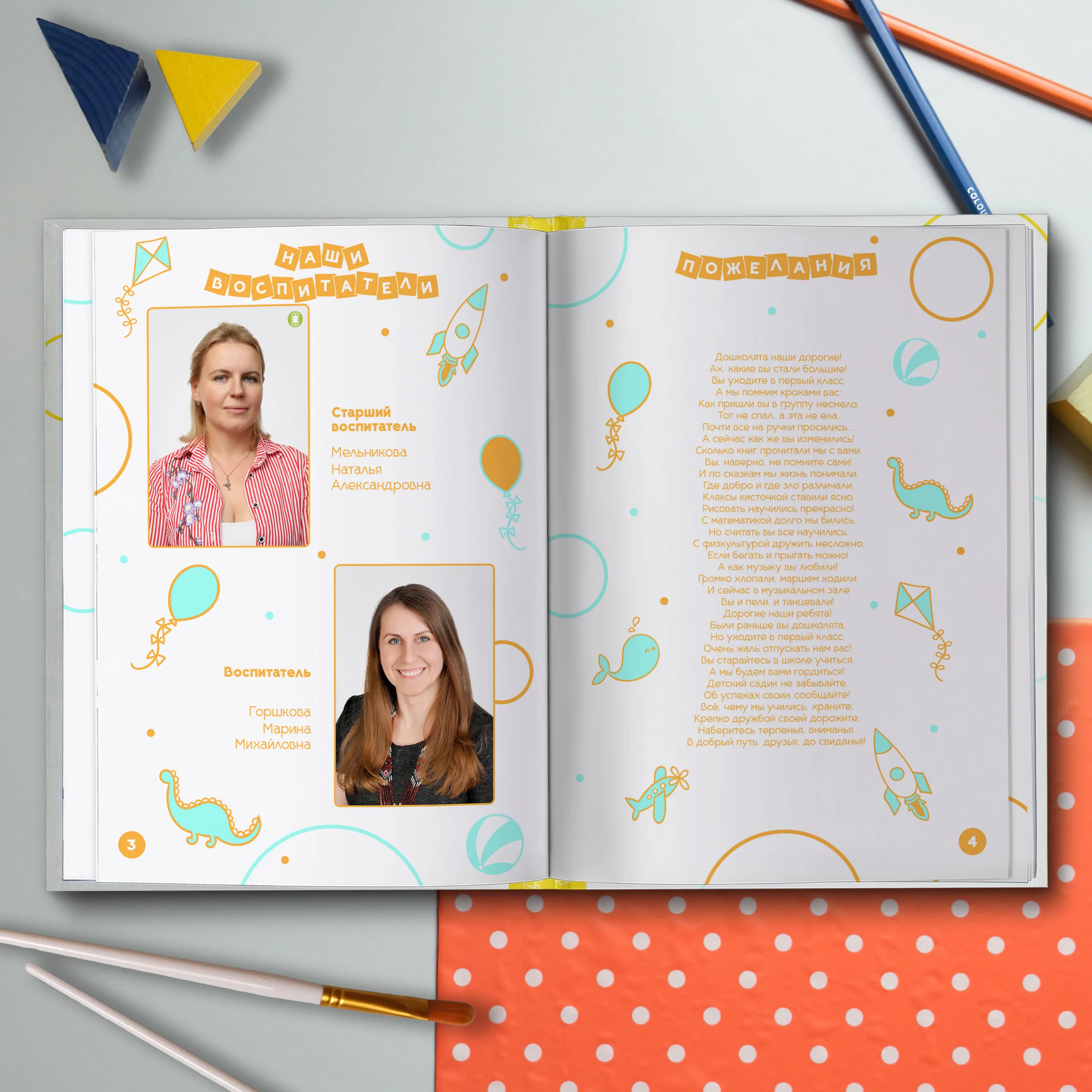1ый разворот — виньетки педагогов и пожелания от воспитателей