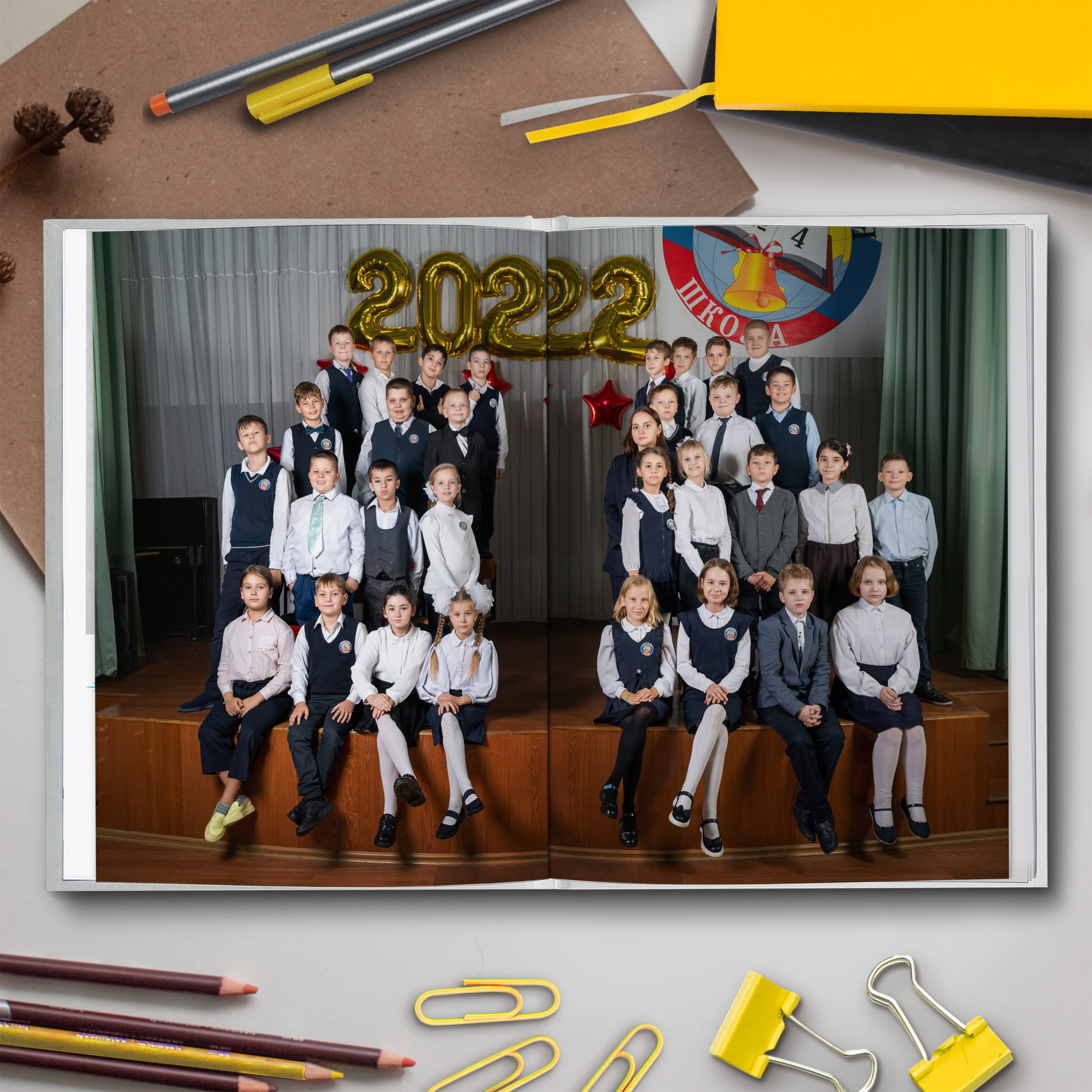 После личных страниц — разворот с общей фотографией класса